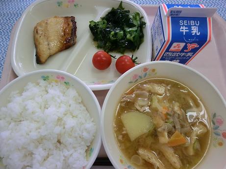 きょうは、 ごはん・牛乳・さばの西京焼き・きゅうりとわかめの 酢の物・豚汁・ミニトマトでした。 きょうは1年4組の「食亭」のみなさんが考えてくれた献立です。 和食の献立で色合いもよく、栄養のバランスがとれています。 |
