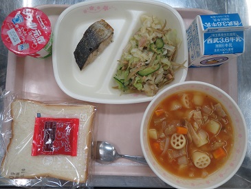 食パン いちごジャム・アジのスパイス焼き・ヘルシーサラダ・