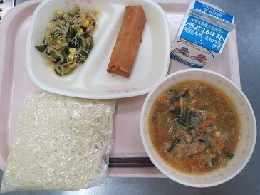 きょうの献立は キムチ入りごまみそラーメン・ひじき入り春巻き・
