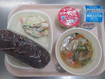 きょうの献立は ココア揚げパン・ポテトサラダ・わんたんスープ・ 元気ヨーグルト・牛乳です。 エネルギー 894 kcal たんぱく質 26.6g 脂 質 35.5g 食塩相当量 3.7g