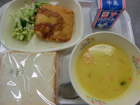 きょうは、 ハムカツサンド・牛乳・パンプキンポタージュ グリーンサラダでした。 ハムカツサンドは、食パンにハムカツを揚げてはさんで食べる 献立です。パンプキンポタージュは角切りのかぼちゃとペースト 状のかぼちゃを使っています。