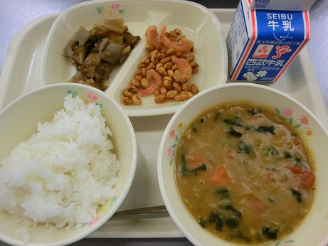 スピナッチカレー・牛乳・大豆と剣エビの唐揚げ