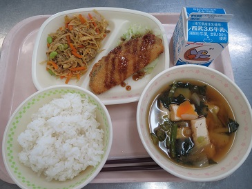 きょうの献立は ごはん・鮭チーズフライ 千キャベツ・ 切干大根のカレーそぼろ煮・みそ汁・牛乳です。