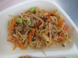 カレーそぼろ煮は 切干大根・にんじん・鶏ひき肉を炒めカレー味に調味して います。仕上げに枝豆を散らしました。