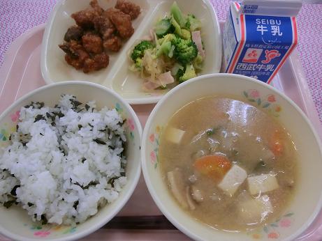 きょうは、 わかめごはん・牛乳・豚肉とレバーのごまだれ ブロッコリーサラダ・みそけんちん汁でした。 豚肉とレバーのごまだれは、ビタミンB1や鉄分を補給 できる料理です。中学生の鉄分の必用量を補うのには工夫 が必要で、ひじきや生揚げ・小松菜などを献立の中に 積極的に使っています。 たいへうう補うのに苦労しています。 |
