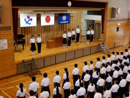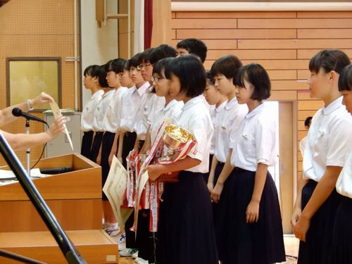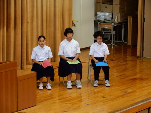 多くの部活動等で、夏休み中に行われた大会などの表彰が行われました。続いて「2学期に向けての抱負」を学年代表が堂々と発表してくれました。