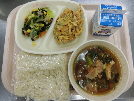 深谷ねぎたっぷりうどん・かき揚げ・ほうれん草ソテー・牛乳