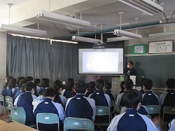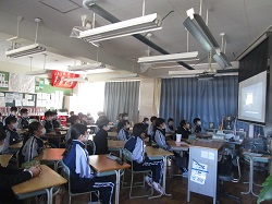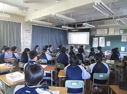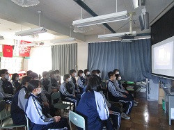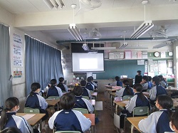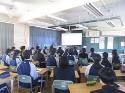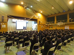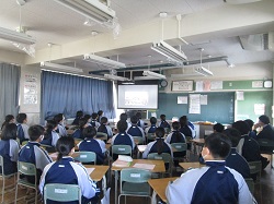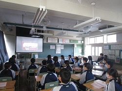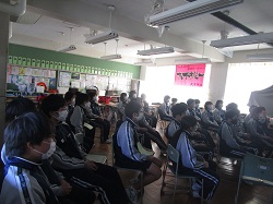 感染症対策として3年生は体育館で、1・2年生は各教室でリモート(体育館と教室を