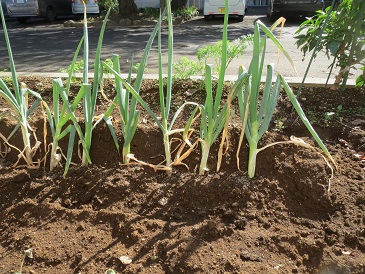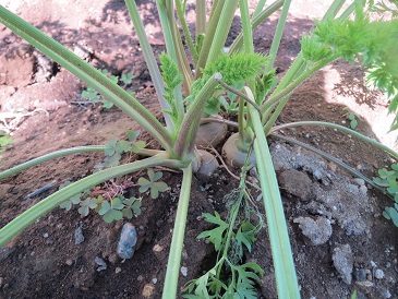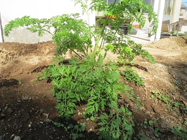 大きさの違うブロッコリー 2回に分けて収穫できそうです。 葉の下を見ると・・・ まだ少し細い大根が見えます この葉、何でしょう? にんじんです。 三つ子になっていました まだまだ小さいですが・・・かき菜 深谷ねぎ収穫が楽しみです