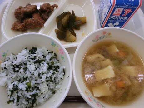 わかめごはんは、生徒に人気のごはんです。豚肉とレバーの