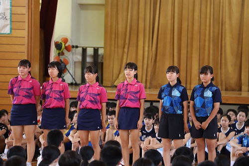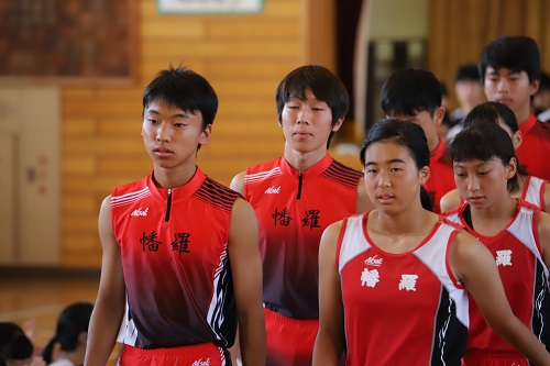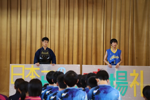 学校総合体育大会県大会の壮行会を行いました。 それぞれの種目でベストを尽くして、がんばってください。