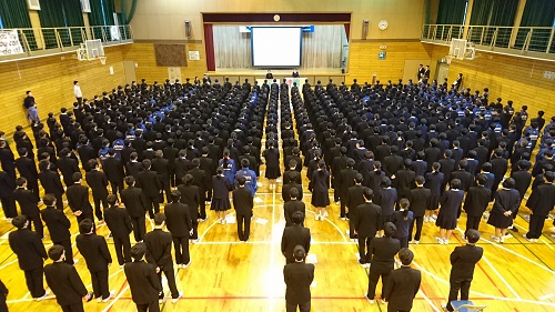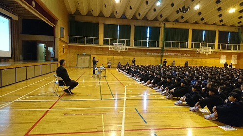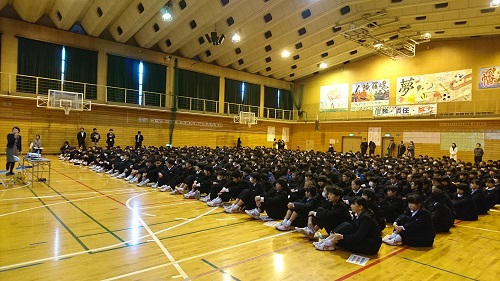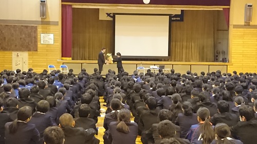 幡羅中学校では、本日から後期人権月間が始まるにあたり、人権集会が行われました。 集会に先立って、挨拶リーダーを中心に挨拶運動が行われ、講師の先生からお褒めの言葉を頂きました。 「SDGs(Sustainable Development Goals。持続可能な開発目標)を知ろう」の演題で、正智深谷高等学校の成田靖先生と宮崎絵里先生から、グローバルな視点で人権問題を考えるお話をしていただきました。