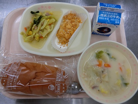黒パン・チキンのフレーク焼き・キャベツのペペロンチーノ・クラムチャウダー・牛乳