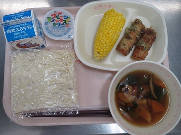 きょうの献立は 五目うどん・ちくわの石垣揚げ・スイートコーン・