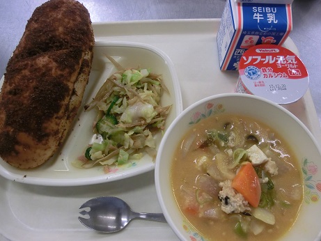 ココア揚げパン・牛乳・肉だんごのキムチスープ
