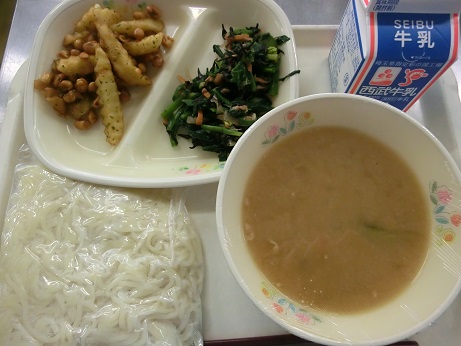 きょうは、 ごまみそラーメン・牛乳・大豆とポテトの揚げ煮・ ほうれんそうのサラダでした。 ほうれんそうのサラダには鉄分を補うためにひじきが入って います。下味をつけてから野菜と一緒に混ぜるので食べやすく なります。最近はひじきの入ったサラダは残らなくなりました。 |