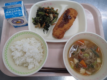ごはん・鮭チーズフライ・小松菜のひじき炒め・豚汁・牛乳