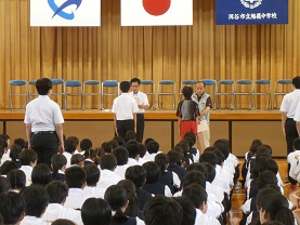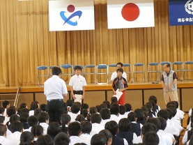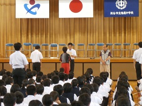 6月15日、思いやり賞の表彰がありました。今回は、保健の仕事を手伝ってくれたり、いつもカギ締めを責任を持って行ってくれている総合文化部と消防活動を行った男子生徒です。幡羅中学校では、生徒のよい行いを表彰しています。皆さんもよい行いをできるよう、日頃から意識して生活してください。
