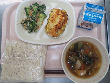 ねぎまうどん・カルシウムパンケーキ・野菜のごまマヨあえ・牛乳