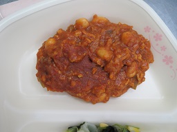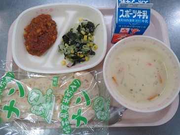 きょうの献立は ナン チリミート・ほうれん草とコーンのソテー・白花豆のスープ・