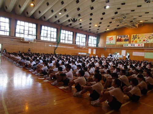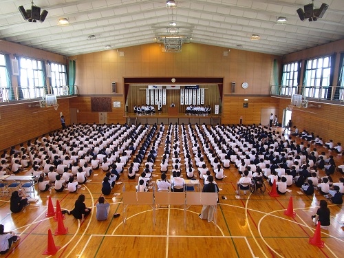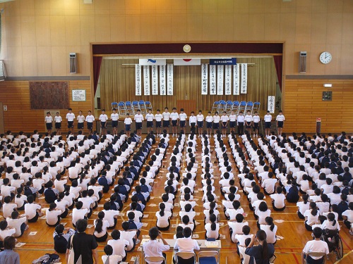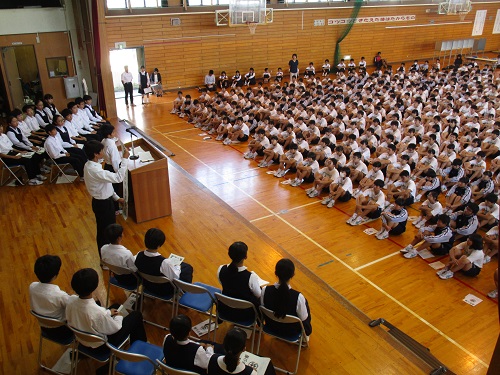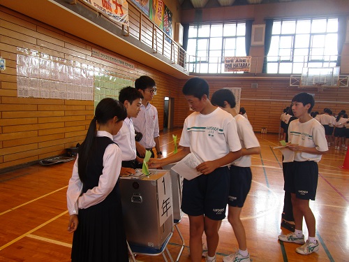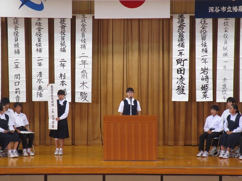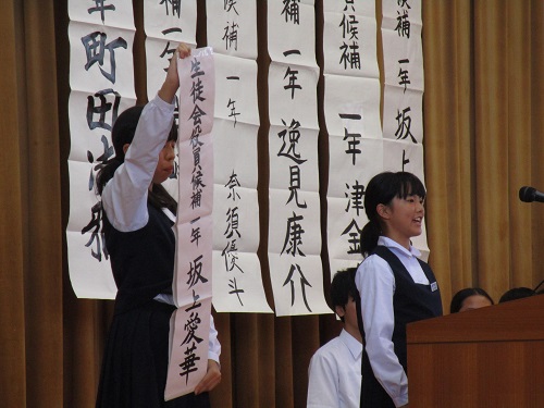 立会演説会では、それぞれの候補者が各自の視点で、学校をよりよくするための公約や考えを力強く発表し、他の生徒も真剣に訴えを聞いていました。