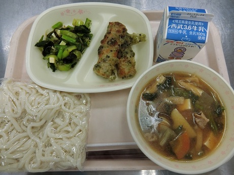 こしねうどん・ちくわの石垣揚げ・骨太サラダ・牛乳