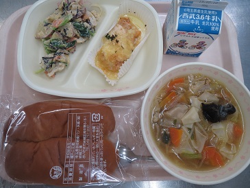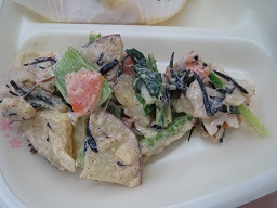 きょうのサラダは、さつまいも・れんこん・小松菜・にんじん・ひじきが入り、