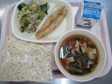 きょうの献立は 肉うどん・ししゃもフリッター・海藻サラダ・巨峰ゼリー・牛乳です。 エネルギー 862 kcal たんぱく質 33.6 g 脂 質 28.1 g 食塩相当量 4.1 g