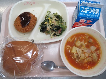 きょうの献立は メンチカツサンド・海藻サラダ・ミネストローネ・牛乳です。