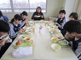 2月9日(木)今日は3年2組のバイキング給食です。通常の給食とは別に、栄養教諭の石井先生と調理員さんたちがバイキング用の給食を準備してくれました。自分の好みのものをカロリー計算しながらいただくものです。既に1組は終了しています。3,4,5組の皆さんは、バイキング給食が楽しみですね。