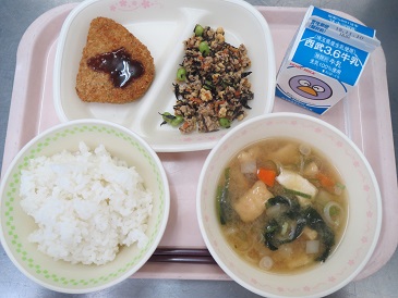 きょうの献立は ごはん・かぼちゃコロッケ・ひじきのそぼろ煮・野菜椀・ みかん・牛乳です。 エネルギー 859 kcal たんぱく質 28.4 g 脂 質 27.1 g 食塩相当量 2.4 g