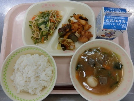 きょうは深谷市の特産品:深谷ねぎをたっぷり(1人55g:全校で41㎏)使った献立です