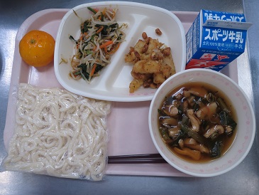 五目うどん・大豆とポテトの揚げ煮・おひたし・冷凍みかん・牛乳