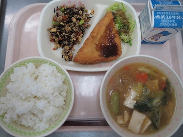きょうの献立は ごはん・チーズはんぺんフライ 千キャベツ・ひじきのそぼろ煮・