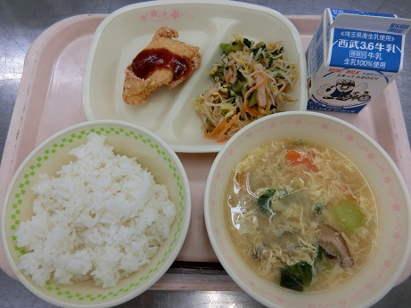 ごはん・ヤンニョムチキン・もやしのナムル・トック入り卵スープ・牛乳です。