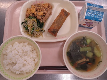 きょうの献立は ビビンバ・春巻き・中華スープ・牛乳です。
