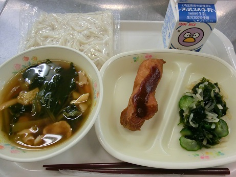 五目うどん・牛乳・アメリカンドッグ・温野菜