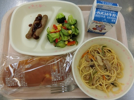 きょうの献立は パインパン・森のきのこスパゲティ・焼きウインナー・三色サラダ・ 牛乳です。
