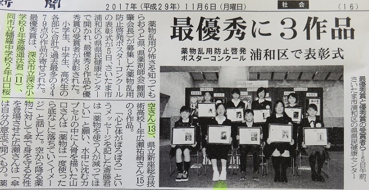 11月5日、さいたま市の県民健康センターにおいて、薬物乱用防止啓発ポスターの県表彰が行われ、本校2年生山口桜空さんが、中学校の部で最優秀賞を受賞しました。おめでとうございます。本校美術部生徒の快挙は、市川実玖さんに続いて本年度2人目です。すごいですね。
