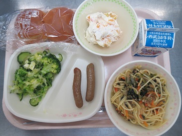 きょうの献立は はちみつパン・ツナとほうれん草のスパゲティ・焼きウインナー・ グリーンサラダ・フルーツクリーム・牛乳です。 エネルギー 949 kcal たんぱく質 34.4g 脂 質 41.2g 食塩相当量 3.3g