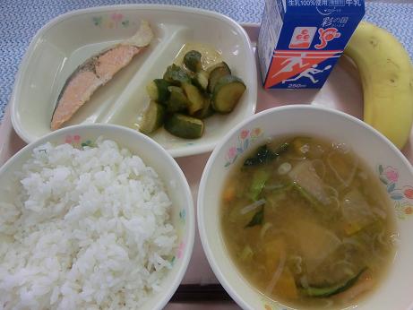 9月1日の防災の日の前日で、「防災の日の献立」です。ごはん・牛乳・鮭の塩焼き・すいとん・きゅうりのピリット漬け バナナでした。すぐに栄養補給ができるバナナや保存できる 小麦粉を使って「すいとん」をつくりました。 いざという時に備えて非常食を準備しておくことが大切ですね。 |