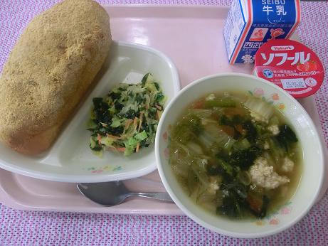 きょうは、 きなこ揚げパン・牛乳・豆腐だんごのスープ・温野菜 みそドレッシング・いちごヨーグルトでした。 豆腐だんごスープの肉団子は、鶏肉、とうふ、しょうが、卵 塩を加えてよく練って作りました。ふんわりと柔らかい肉団子 ができ、残りがほとんどありませんでした。