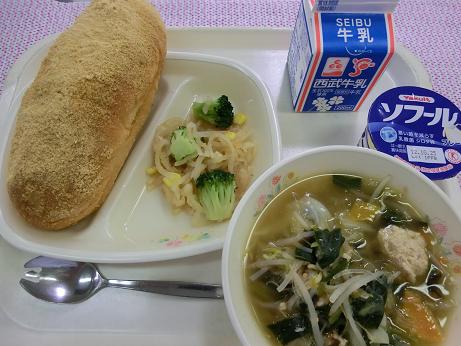 きょうは、 きなこ揚げパン・牛乳・肉団子と春雨のスープ 温野菜ドレッシング・トーグルトでした。 肉団子のスープは鶏肉と豚肉のひき肉に玉ねぎ、しょうが 卵を入れて塩こしょうで練り合わせて肉団子を作りました。 湯気の昇った大きな鍋に肉団子を落として作るので、調理 員さんはやけどをしないように注意して作っています。