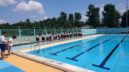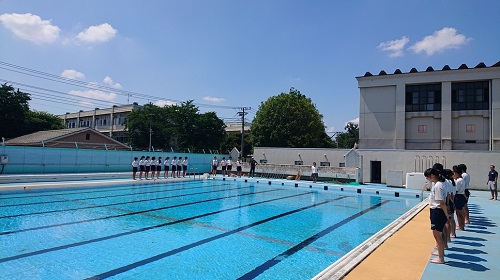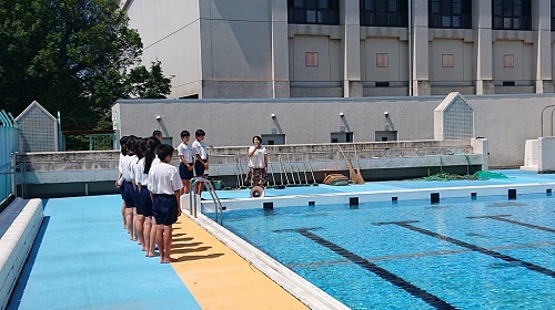 本日、プール開きを実施しました。 今年度の水泳授業の安全祈願を校長先生、体育部の先生方、体育委員と生徒会のみんなで行いました。