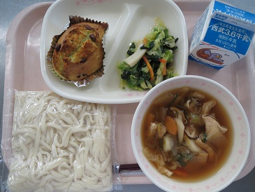 きょうの献立は けんちんうどん・抹茶パンケーキ・小松菜と蒲鉾の炒め物・