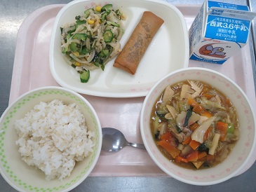 きょうの献立は 中華丼・ひじき入り春巻き・大根とじゃこのサラダ・牛乳です。