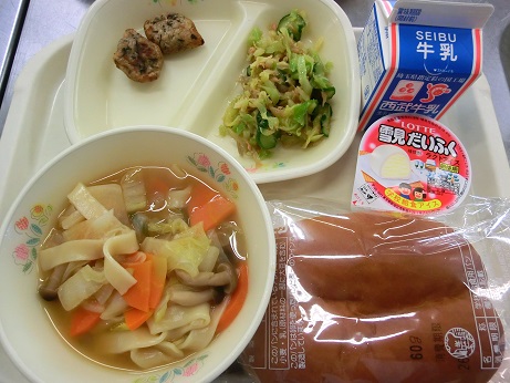 黒パン・牛乳・煮ぼうとう・ひじき入りつくね・ヘルシー
