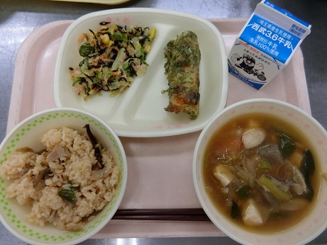 雷ごはん・ちくわの磯辺揚げ・ツナとひじきのサラダ・けんちん汁・牛乳です。