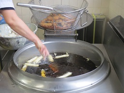 全体がきれいに揚がるように、ひっくり返しながら揚げています