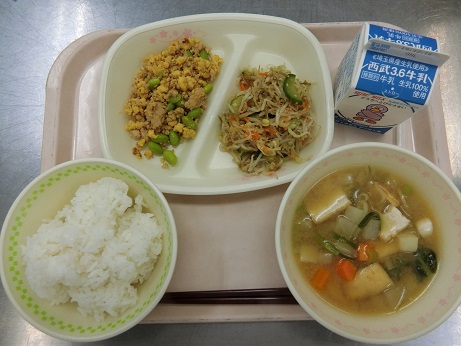三色そぼろごはん・切干大根のサラダ・野菜椀・牛乳